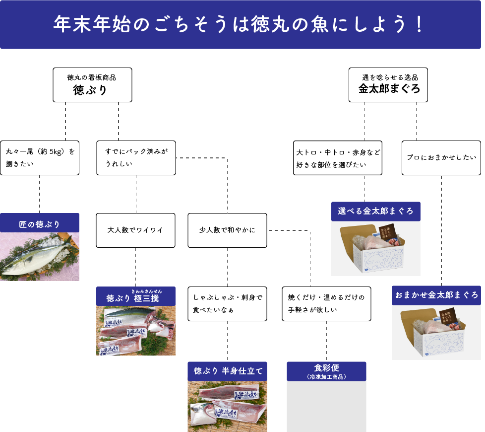 「お正月に新鮮でおいしいお魚を食べたいけれど、何がいいのかわからない。決められない!」そんなお客様のお悩みは、商品選びチャートで解決!あなたと徳丸の商品の相性が10秒でわかります